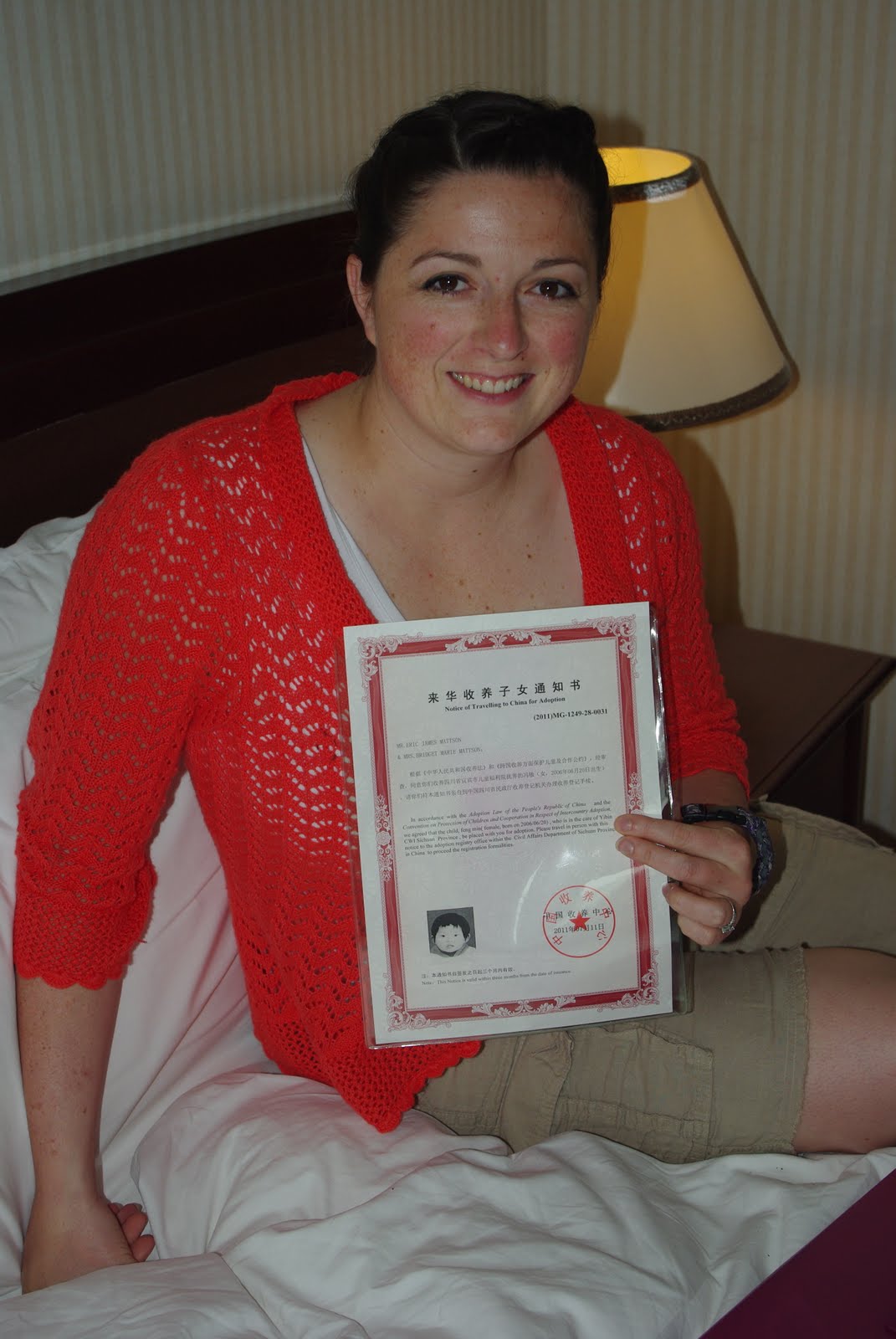 Our guide told Min that we would take her to McDonald's before she left us all off at the hotel after filling out some adoption paperwork, so much to my dismay(something just felt so very wrong about that being her first meal with us, especially when I don't like it in the US:)) we got her a happy meal. She was very happy. We went back to the hotel, she loved the huge panda in the water fountain wall at the entrance of the hotel. We took her to buy some shoes which she loved. We got two pairs for about $13 USD! She let me hold her and kept patting my nose. It is much bigger than hers:)She colored at the desk in the hotel room for a while, she is very good at coloring and very meticulous about having things just so. We showed her the bag of hair bows I brought for her, she wanted every single one in her hair, the we painted our toenails, DH opted out of that one, and her fingernails. Then we gave her her new pink pajamas and she laid down after tucking her doll in next to her and went to sleep. Not a frown, not a sigh, nothing but smiles and happiness the whole day. While we know, and are praying for her to be able to grieve with us, today was a huge gift. It was like a Disney movie and could not have gone better with a song and dance number(and I have a weakness for those!) It was a huge blessing and Eric and I are in awe of this sweet little girl who tomorrow will legally be our daughter.